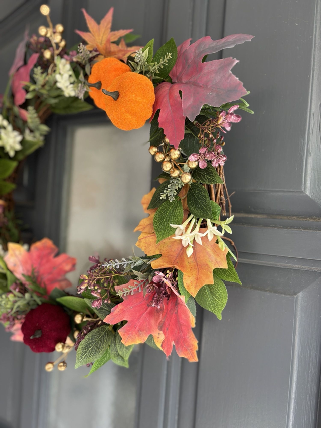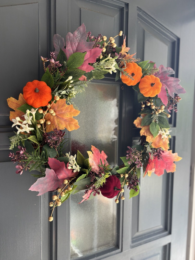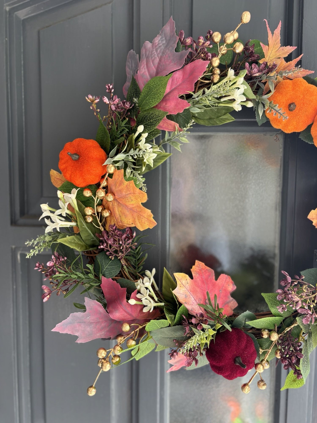 This autumn wreath is a stunning blend of rich, vibrant colours and seasonal elements! It features a base of purple, red and orange leaves, creating a bold and warm autumnal backdrop. The gold berries add a touch of elegance and shimmer, catching the light beautifully. A mix of orange and burgundy pumpkins - brings a playful, harvest-inspired charm. The combination of these colours and textures suggests a lush, eye-catching wreath that balances rustic autumn vibes with a touch of refinement.